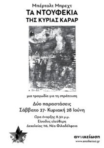 Οσοι δεν προλάβατε ή δεν μπορέσατε να δείτε το κλασικό έργο του Μπέρτολτ Μπρεχτ «Τα ντουφέκια της κυρίας Καράρ», στο σύγχρονο-επικαιροποιημένο ανέβασμά του από την ανοικείωση (ως μια τραγωδία για τη στράτευση),…