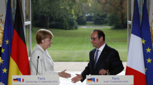 Το στήσιμο της φωτογραφίας υπηρετούσε συγκεκριμένους συμβολισμούς. «Παρίσι, Πέμπτη 15 Σεπτέμβρη 2016» γράφει η πινακίδα μπροστά από κάθε ηγέτη (στα γερμανικά για τη Μέρκελ, στα γαλλικά για τον Ολάντ), ενώ η σύνθεση…