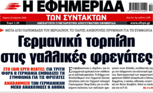 Δεν είναι κάποια αντιπολιτευόμενη εφημερίδα. Είναι η κυβερνητικότατη ΕφΣυν που διαμαρτυρόταν (και κατήγγειλε) από το πρωτοσέλιδό της την περασμένη Πέμπτη: «Γερμανική τορπίλη στις γαλλικές φρεγάτες – Μετά από παρέμβαση του Βερολίνου, το…