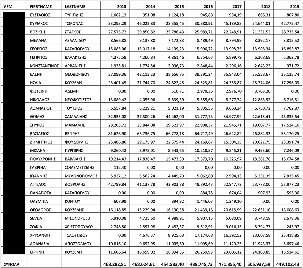 Οι 29 που εισέπραξαν παράνομα τις επιδοτήσεις φαίνονται στον παρακάτω πίνακα, ο οποίος περιλαμβάνεται στο έγγραφο που έστειλε στις 29 Οκτώβρη του 2023 στο Ελληνικό Γραφείο Ευρωπαίων Εντεταλμένων Εισαγγελέων, που διεξήγαγε Προκαταρκτική Εξέταση, ο τότε πρόεδρος του ΟΠΕΚΕΠΕ Ευάγγελος Σημανδράκος, δύο μήνες πριν από τον εξαναγκασμό του σε παραίτηση από τον Αυγενάκη.