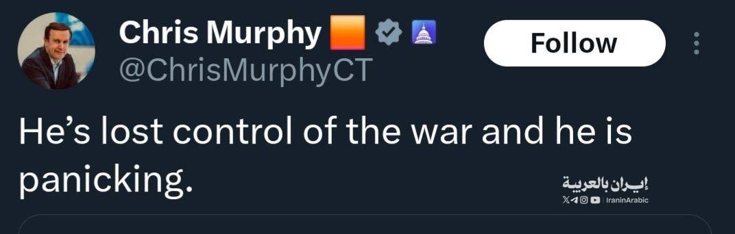 Ο γερουσιαστής Κρις Μέρφι, παλιά καραβάνα του αμερικάνικου ιμπεριαλισμού, τα είπε όλα με λίγες λέξεις, αναφερόμενος στον Τραμπ: Εχει χάσει τον έλεγχο του πολέμου και βρίσκεται σε πανικό.