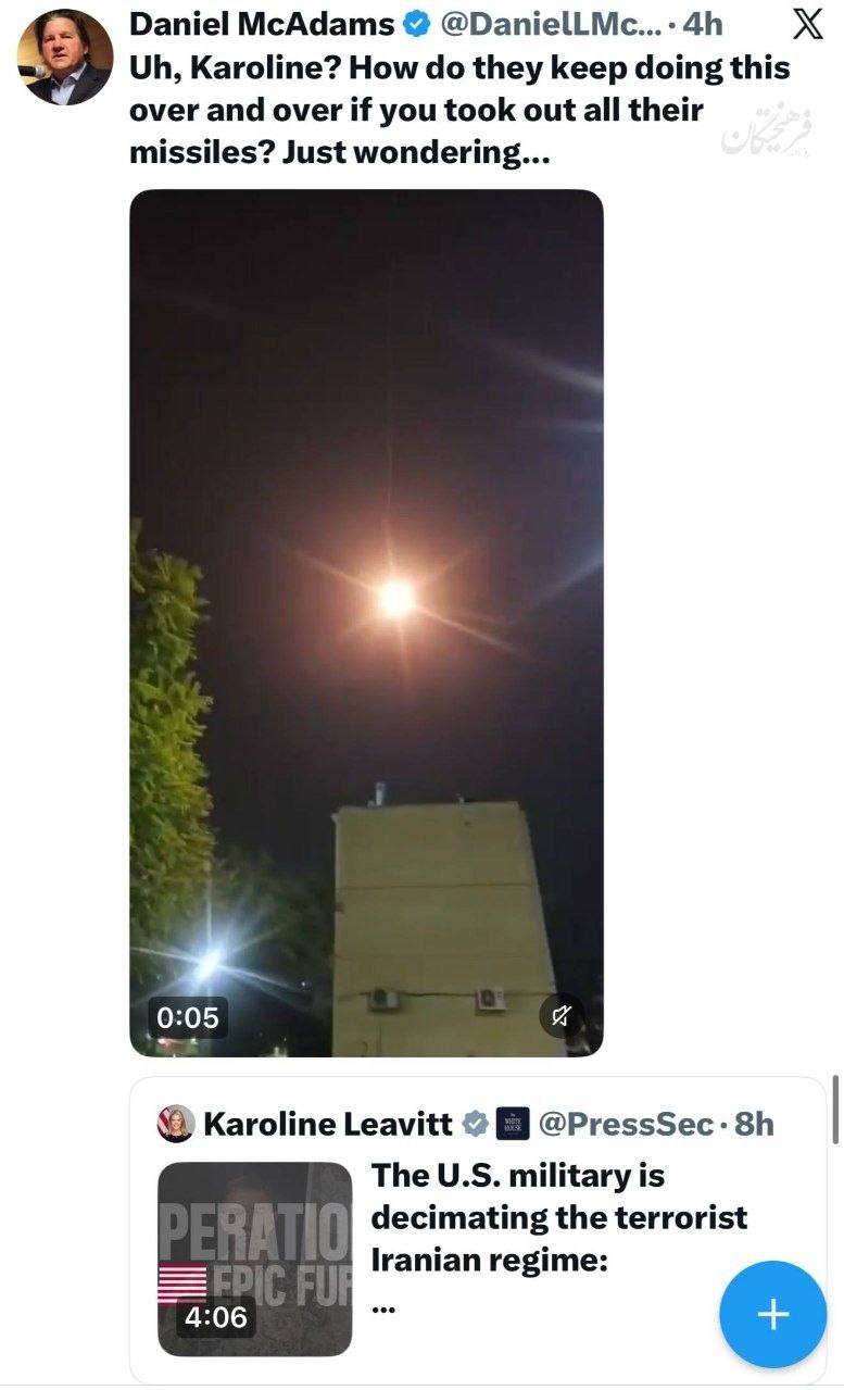 Eνας επιδραστικός αμερικανός αναλυτής στρατηγικών θεμάτων, τρολάρει την Καρολάιν Λίβιτ, εκπρόσωπο Τύπου του Λευκού Οίκου, που είχε κάνει ανάρτηση ότι «ο αμερικάνικος στρατός αποδεκατίζει το τρομοκρατικό ιρανικό καθεστώς». Εγραψε ο Ο Ντάνιελ ΜακΑνταμς: «Αχ, Καρολάιν; Πώς μπορούν και συνεχίζουν να το κάνουν αυτό ξανά και ξανά, αν εσύ είχες καταστρέψει όλους τους πυραύλους τους; Απλώς αναρωτιέμαι…!»