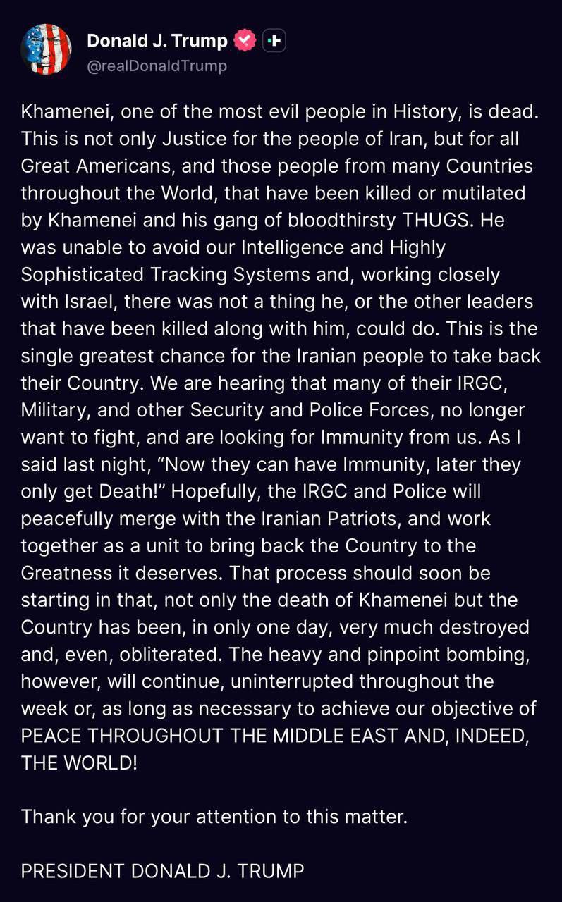 Συζητιέται μόνο ο θάνατος του ανώτατου πνευματικού ηγέτη της Ισλαμικής Δημοκρατίας του Ιράν, του 87χρονου (γεννημένος στις 19 Απρίλη του 1939) ιμάμη Αλί Χαμενεΐ (στο περιθώριο περνά και εδώ η δολοφονία αμάχων, μελών της οικογένειάς του, όπως η κόρη του, ο γαμπρός του, ο εγγονός του και άλλα πρόσωπα) και δύο στρατιωτικών ηγετών του Σώματος των Φρουρών της Ιρανικής Επανάστασης.