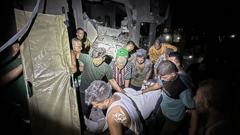 Συγκλονιστικές στιγμές σήμερα στη Τζαμπάλια Αλ-Μπάλαντ, στο βορρά της Λωρίδας της Γάζας, όπου οι σιωναζιστές βομβάρδισαν με πολεμικά αεροπλάνα ένα μπλοκ κατοικιών, θάβοντας κάτω από τα ερείπιά του τα μέλη τεσσάρων παλαιστινιακών οικογενειών: των οικογενειών Νταρντόνα, Ζουνάιντ, Ασάφ και Αζάμ.