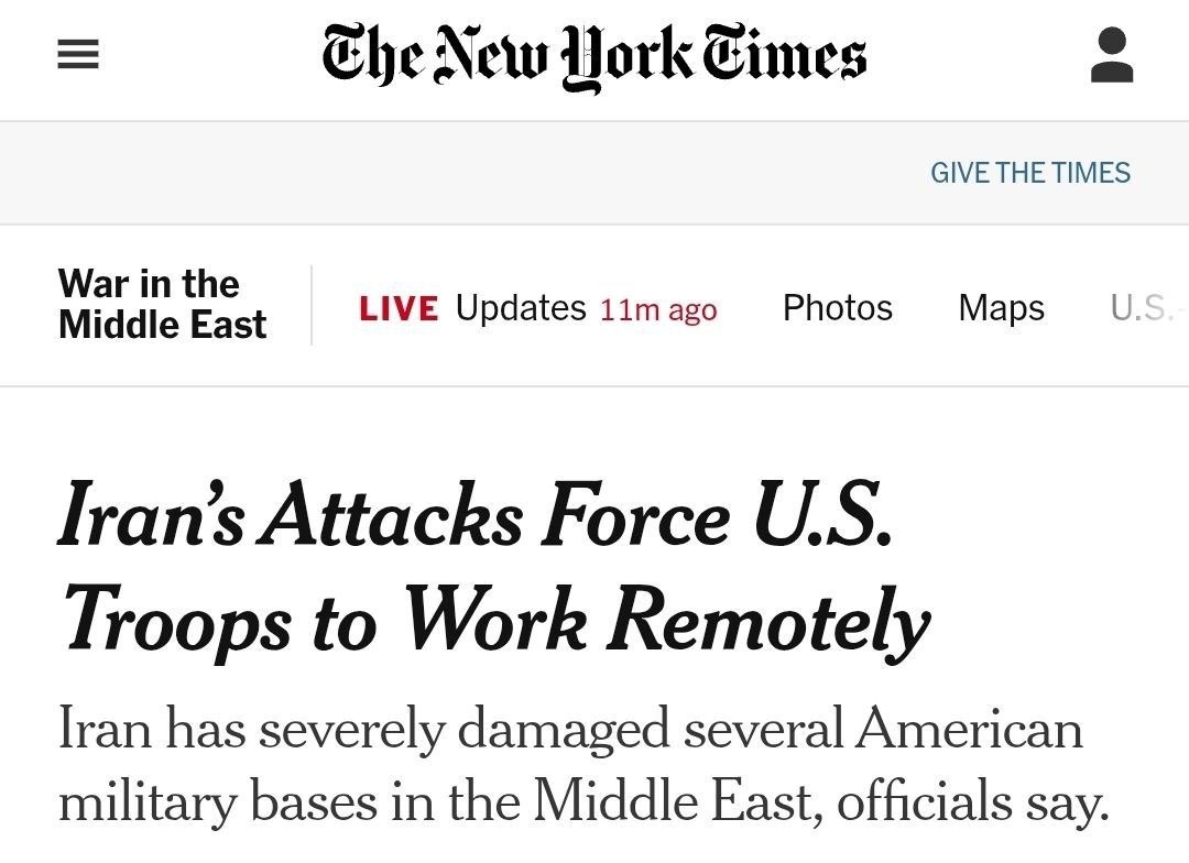 Σύμφωνα με τους New York Times, που επικαλούνται στρατιωτικούς και αμερικανούς αξιωματούχους, το Ιράν βομβάρδισε αμερικανικές βάσεις σε όλη τη Μέση Ανατολή ως απάντηση στον αμερικανοσιωνιστικό πόλεμο, αναγκάζοντας πολλές αμερικανικές δυνάμεις να μετακινηθούν σε ξενοδοχεία και γραφεία στην περιοχή. Ως εκ τούτου, οι περισσότερες χερσαίες δυνάμεις διεξάγουν τον πόλεμο εξ αποστάσεως, εκτός από τους πιλότους μαχητικών και τα πληρώματα που χειρίζονται, συντηρούν τα μαχητικά αεροσκάφη και εκτελούν επιθέσεις!