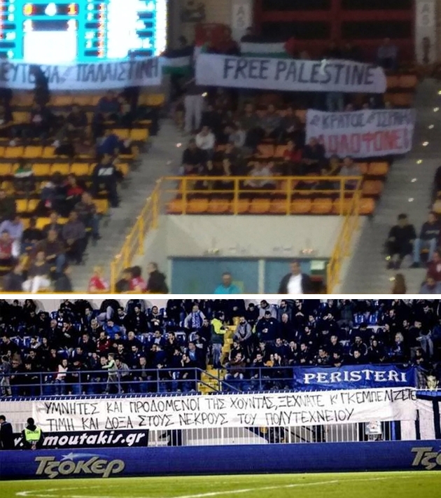 Οι φωτογραφίες της στήλης είναι η απάντηση που έδωσαν οι οργανωμένοι οπαδοί του Ατρόμητου στα φασισταριά του ΑΠΟΕΛ (για την αμφισβήτηση της εξέγερσης του Πολυτεχνείου στο ντέρμπι με τον Παναθηναϊκό) και η πολιτική παρέμβαση υπέρ του παλαιστινιακού λαού, που έγινε στον αγώνα μπάσκετ Ελλάδας – Ισραήλ για τα προκριματικά του παγκοσμίου κυπέλλου, που έγινε στο κλειστό γυμναστήριο στο Ηράκλειο Κρήτης. Δυο φωτογραφίες που δείχνουν αφενός ότι η ενορχηστρωμένη προσπάθεια σύσσωμου του αθλητικού εσμού για να επικρατήσει το δόγμα του «No Politica» δεν έχει αποδώσει τους καρπούς που θα ήθελαν οι εμπνευστές της και αφετέρου την κατάντια των οργανωμένων οπαδών του Ολυμπιακού και της ΑΕΚ, που έχουν μετατραπεί σε υποστηρικτές και συνοδοιπόρους των επιχειρηματικών συμφερόντων των καπιταλιστών που διοικούν τις ομάδες τους.
