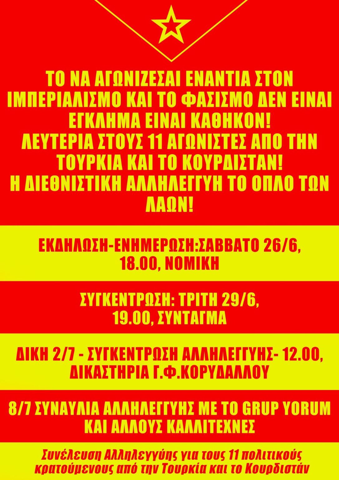 Την ερχόμενη Παρασκευή, 2 Ιούλη, ξεκινά στη δικαστική αίθουσα των Γυναικείων Φυλακών Κορυδαλλού η δίκη των 11 αγωνιστών από την Τουρκία, που κατηγορούνται για «τρομοκρατία». Στις 19 Μάρτη του 2020 έγινε έφοδος της «Αντι»τρομοκρατικής και της ΕΥΠ/ΚΥΠ στα γραφεία της Επιτροπής αλληλεγγύης για τους πολιτικούς κρατούμενους στην Τουρκία και το Κουρδιστάν καθώς και σε σπίτι στα Σεπόλια. Πήραν σηκωτούς 26 αγωνιστές, ανάμεσά τους και ανθρώπους με κινητικά προβλήματα, λόγω του βασανιστήριου της υποχρεωτικής σίτισης που είχαν υποστεί στις τουρκικές φυλακές. Προφυλάκισαν 11 με την κατηγορία της «τρομοκρατικής οργάνωσης». Ο αγώνας για την ελευθερία δεν είναι τρομοκρατία. Τρομοκρατία είναι αυτά που υφίστανται οι λαοί και όσοι αντιστέκονται σε ανελεύθερα καθεστώτα όπως αυτό της Τουρκίας. Γι’ αυτό και είμαστε αλληλέγγυοι στους 11 αγωνιστές. Απαιτούμε την απαλλαγή τους από το σύνολο των κατασκευασμένων κατηγοριών και την απελευθέρωσή τους. Την Τρίτη (29 Ιούνη), στις 7μμ θα γίνει συγκέντρωση στο Σύνταγμα. Την Πέμπτη 8 Ιούλη…