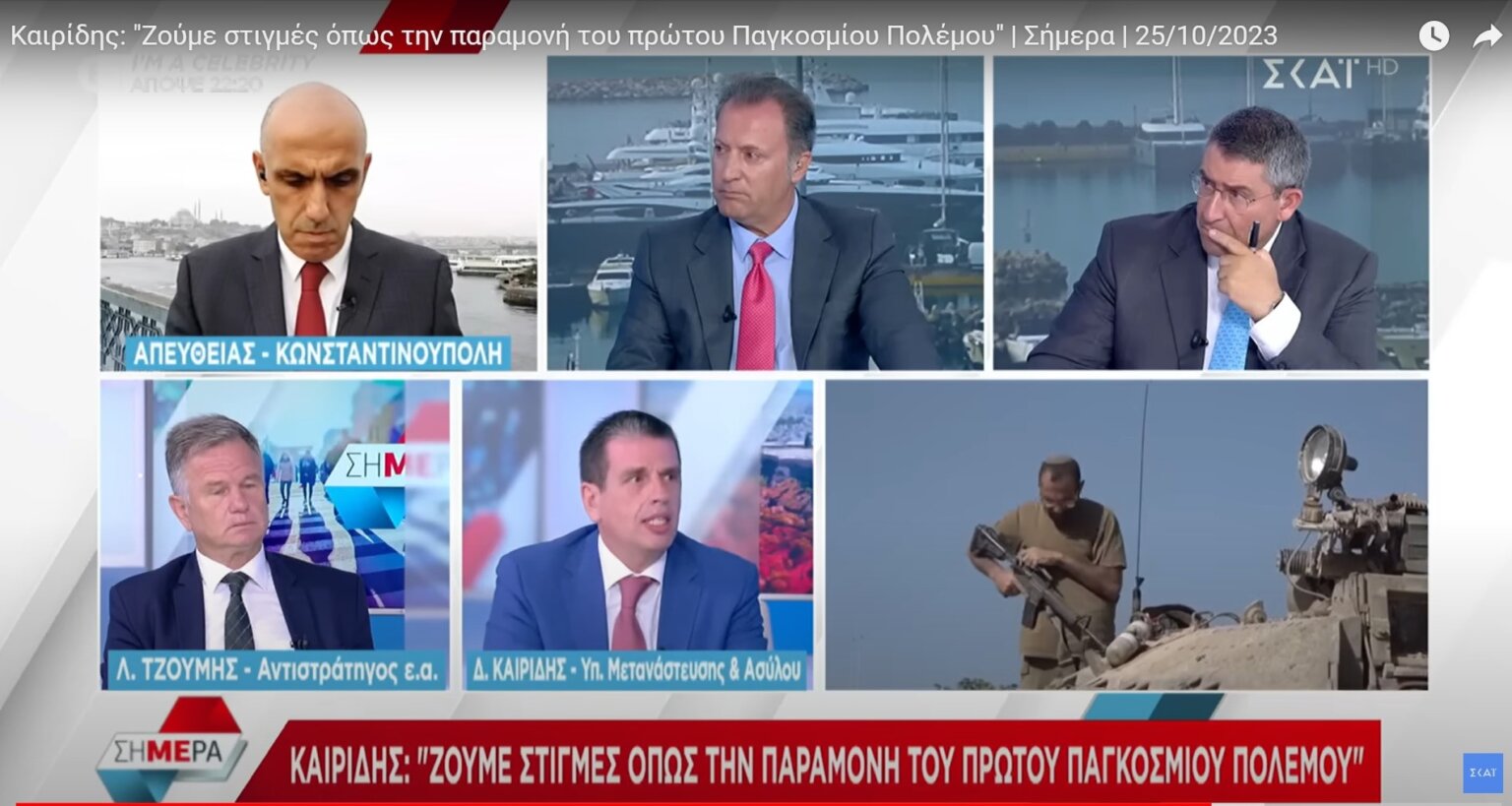 Ο πάντας αμετροεπής και προκλητικός Καιρίδης εμφανίστηκε χτες στο πρωινάδικο (Οικονόμου- Παυλόπουλος) του πάντα φιλόξενου για τις κυβερνητικές απόψεις ΣΚΑΪ. Ο υπουργός Μετανάστευσης και Ασύλου έκανε μια ανάλυση αμπελοφιλοσοφίας περί κόσμου που ξαναμοιράζεται και καλλιέργησε φόβο για τη συγκέντρωση προσφύγων, όχι μόνο στην Παλαιστίνη αλλά στον αραβικό δρόμο (“Arab Street), στην Αίγυπτο των 9 εκατομμυρίων προσφύγων, που βιώνει και επισιτιστική κρίση λόγω του Ουκρανικού. Επιπλέον, την ώρα που η Γάζα βομβαρδίζεται από τους ισραηλινούς σιωναζιστές, έδωσε ρεσιτάλ κυνισμού δηλώνοντας ότι η Ελλάδα «έχει πάρει θέση μαζί με την υπόλοιπη Ευρώπη, μαζί με τη Δύση, υπέρ του Ισραήλ». Είπε πως «έχουμε εισροή ισραηλινών τουριστών από τα τουρκικά παράλια, από τη Δωδεκάνησο». «Αν κάποιοι ήρθαν δεν ήταν Παλαιστίνιοι», σημείωσε, τονίζοντας ότι «το αεροδρόμιο Αθηνών είναι ένας κόμβος σήμερα ανοικτός προς το Ισραήλ» και πως «έχουμε αύξηση αιτήσεων για golden visa».