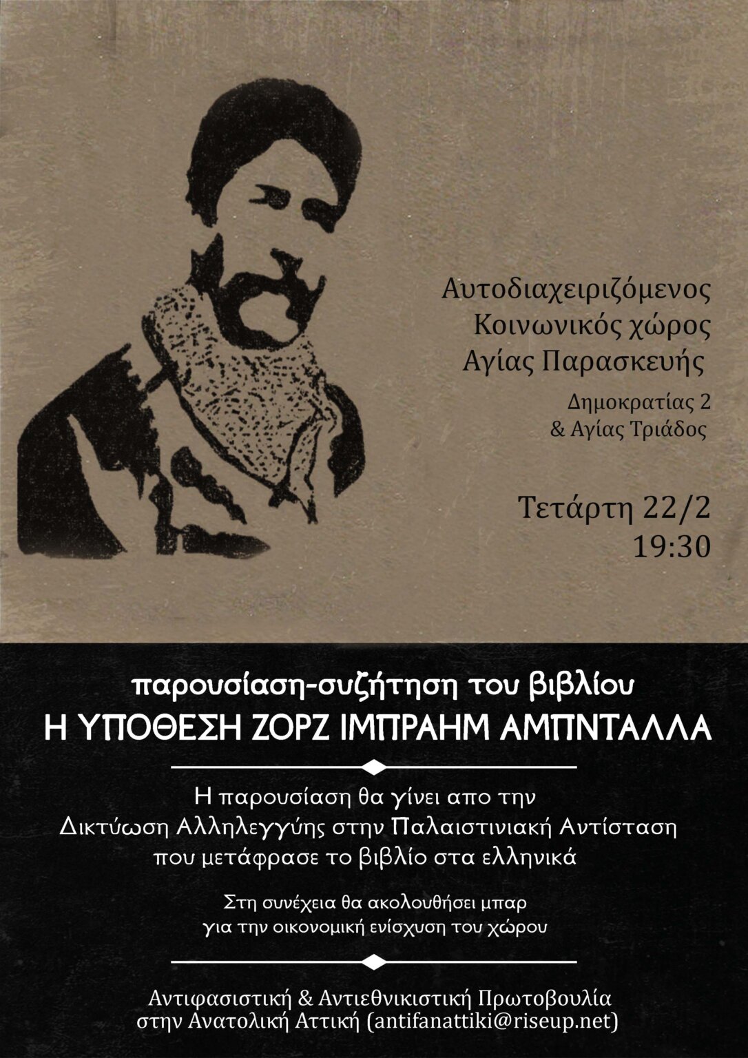 Παρουσίαση-συζήτηση του βιβλίου Η ΥΠΟΘΕΣΗ ΖΟΡΖ ΙΜΠΡΑΗΜ ΑΜΠΝΤΑΛΛΑ του Σαΐντ Μπουαμαμά την Τετάρτη 22 Φλεβάρη, στις 7:30 μ.μ. στον Αυτοδιαχειριζόμενο Κοινωνικό Χώρο Αγίας Παρασκευής Δημοκρατίας 2 & Αγ. Τριάδος Το βιβλίο αναδεικνύει την ιστορία και τον αγώνα του Λιβανέζου κομμουνιστή και μαχητή της παλαιστινιακής αντίστασης, Ζορζ Ιμπραήμ Αμπνταλλά, του παλαιότερου πολιτικού κρατούμενου στην Ευρώπη, έγκλειστου στις γαλλικές φυλακές επί 38 χρόνια ήδη. Η υπόθεση Αμπνταλλά συνιστά ένα τεράστιο πολιτικό και νομικό σκάνδαλο. Ξεκινά με δίκες-παρωδία, απροκάλυπτο στήσιμο τρομοδικών, φανερή ανάμειξη των ΗΠΑ, χειραγώγηση της γαλλικής «κοινής γνώμης» από τον Τύπο, εκδικητική μέχρι σήμερα κράτηση και συνεχίζεται με την άρνηση του γαλλικού κράτους να τον αποφυλακίσει υπό όρο –παρότι το δικαιούται από το 1999– επειδή δεν αποκηρύσσει τις πολιτικές του ιδέες. Αυτή η διαχείριση αποτέλεσε μοντέλο για πολλές χώρες, συμπεριλαμβανομένης της Ελλάδας, παντού όπου η κατηγορία της τρομοκρατίας αναγορεύθηκε σε μηχανισμό φίμωσης όσων εναντιώνονται. Ο συγγραφέας τοποθετεί την αντίσταση της οργάνωσης του Αμπνταλλά, και ευρύτερα τις αντιστάσεις των λαών της «περιφέρειας» μέσα…