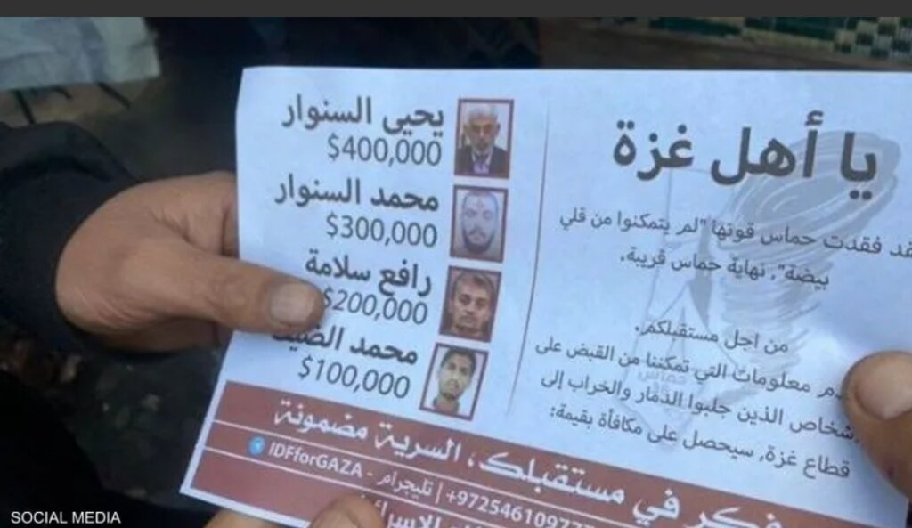 Τα ‘χουν παίξει οι σιωναζιστές και συμπεριφέρονται (και) σαν παιδάκια. Μετά τις αφίσες επικήρυξης του Σινουάρ (διαβάστε: Τα κηδειόχαρτα της απελπισίας), ήρθαν κάποια φυλλάδια που πετούν τα αεροπλάνα. Αυτή τη φορά δεν ζητούν το… κεφάλι του Σινουάρ για 25.000 ευρώ, αλλά προσφέρουν… αυξημένη αμοιβή για απλές πληροροφορίες. Αμοιβή για όποιον δώσει πληροφορίες για το πού βρίσκονται ο Γιάχια Αλ-Σινουάρ (400.000 δολάρια), ο αδελφός του Μοχάμεντ Αλ-Σινουάρ, ηγέτης της νότιας ταξιαρχίας των Αλ-Κασάμ (300.000 δολάρια), ο Ράφι Σαλαμά, διοικητής της ταξιαρχίας Χαν Γιούνις (200.000 δολάρια) και ο Μοχάμεντ Αλ-Ντεΐφ, ανώτατος διοικητής των Αλ-Κασάμ (100.000 δολάρια).