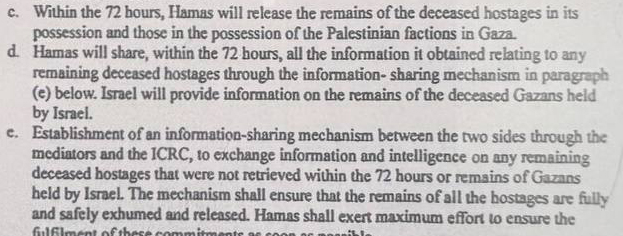 e. Θα δημιουργηθεί μηχανισμός ανταλλαγής πληροφόρησης μεταξύ των δύο πλευρών μέσω των μεσολαβητών και του Διεθνούς Ερυθρού Σταυρού, για να ανταλλαγεί πληροφόρηση για κάθε θανόντα αιχμάλωτο που έχει αποκτηθεί εντός των 72 ωρών ή για σορούς Γαζαίων που κρατούνται από το Ισραήλ. Ο μηχανισμός θα διασφαλίσει ότι οι σοροί όλων των αιχμάλωτων θα εκταφούν πλήρως και με ασφάλεια και θα απελευθερωθούν. Η Χαμάς θα καταβάλει τη μέγιστη προσπάθεια για να διασφαλίσει την εκπλήρωση αυτών των δεσμεύσεων το συντομότερο δυνατό.