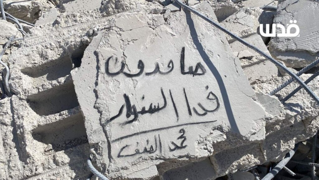 Τζενίν, Δυτική Οχθη, Παλαιστίνη. Μια ακόμα εισβολή του σιωναζιστικού στρατού υπό τα πυρά των παλικαριών της Αντίστασης. Στα νότια της πόλης, στο συνοικισμό Μασαφέρ Ιάτα, κατέστρεψαν το σπίτι μιας εντεκαμελούς οικογένειας σε αντίποινα για τη συμμετοχή μέλους της στην Αντίσταση. Η οικογένεια έγραψε σε μια σπασμένη τσιμεντόπλακα στην κορυφή των ερειπίων: «Παραμένουμε ακλόνητοι. Αυτό είναι αφιερωμένο στον Σινουάρ και στον Αλ-Ντέιφ. Αφιερωμένο στην Αντίσταση».