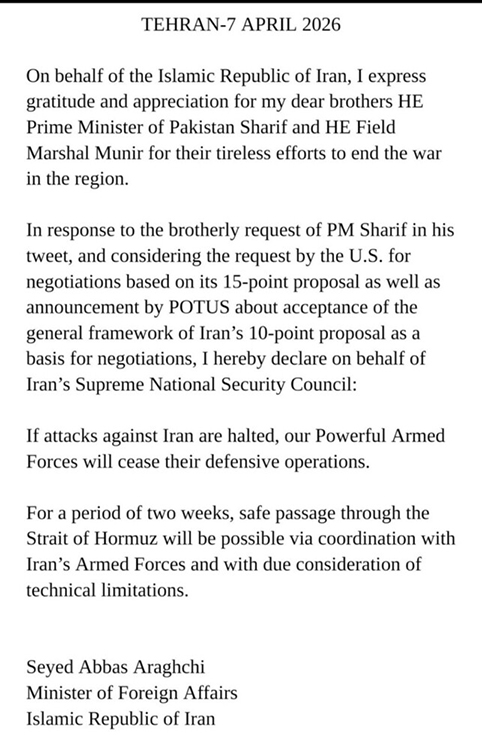 Ο Πρωθυπουργός του Πακιστάν ενημέρωσε το Ιράν ότι η αμερικανική πλευρά, παρά τις δημόσιες απειλές της, έχει αποδεχτεί αυτές τις αρχές ως βάση για διαπραγματεύσεις και έχει υποκύψει στη βούληση του ιρανικού λαού. Κατά συνέπεια, αποφασίστηκε στο ανώτατο επίπεδο ότι το Ιράν θα εισέλθει σε διαπραγματεύσεις για διάστημα μόνο δύο εβδομάδων, βάσει αυτών των αρχών, στο Ισλαμαμπάντ με την αμερικανική πλευρά. Τονίζεται ότι αυτό δεν σημαίνει το τέλος του πολέμου, καθώς το Ιράν δεν θα αποδεχτεί τη λήξη του έως ότου οι λεπτομέρειες αυτών των αρχών κατοχυρωθούν μέσω διαπραγματεύσεων.