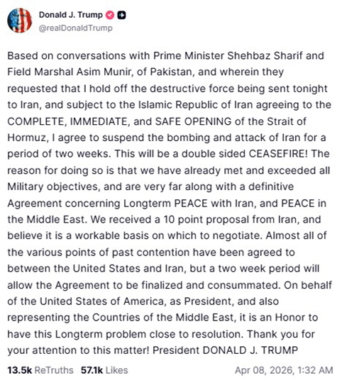 «Με βάση συνομιλίες με τον Πρωθυπουργό Σεχμπάζ Σαρίφ και τον Στρατάρχη Ασίμ Μουνίρ του Πακιστάν, κατά τις οποίες ζήτησαν να αναστείλω την καταστροφική δύναμη που επρόκειτο να σταλεί απόψε στο Ιράν, και υπό την προϋπόθεση ότι η Ισλαμική Δημοκρατία του Ιράν θα συμφωνήσει στο ΠΛΗΡΕΣ, ΑΜΕΣΟ και ΑΣΦΑΛΕΣ ΑΝΟΙΓΜΑ του Στενού του Ορμούζ, συμφωνώ να αναστείλω τον βομβαρδισμό και την επίθεση κατά του Ιράν για περίοδο δύο εβδομάδων. Αυτό θα αποτελέσει μια δίπλευρη ΚΑΤΑΠΑΥΣΗ ΤΟΥ ΠΥΡΟΣ! Ο λόγος για τον οποίο γίνεται αυτό είναι ότι έχουμε ήδη επιτύχει και υπερβεί όλους τους Στρατιωτικούς στόχους και βρισκόμαστε πολύ κοντά σε μια οριστική Συμφωνία σχετικά με τη Μακροπρόθεσμη ΕΙΡΗΝΗ με το Ιράν και την ΕΙΡΗΝΗ στη Μέση Ανατολή. Λάβαμε μια πρόταση 10 σημείων από το Ιράν και πιστεύουμε ότι αποτελεί μια λειτουργική βάση για διαπραγμάτευση. Σχεδόν όλα τα διάφορα σημεία παλαιότερης διαφωνίας έχουν συμφωνηθεί μεταξύ των Ηνωμένων Πολιτειών και του Ιράν, αλλά μια περίοδος δύο εβδομάδων θα επιτρέψει την οριστικοποίηση και ολοκλήρωση της Συμφωνίας. Εκ μέρους των Ηνωμένων Πολιτειών της Αμερικής, ως Πρόεδρος, και επίσης εκπροσωπώντας τις Χώρες της Μέσης Ανατολής, αποτελεί Τιμή να βρίσκεται αυτό το Μακροχρόνιο πρόβλημα κοντά στην επίλυσή του. Σας ευχαριστώ για την προσοχή σας σ’ αυτό το ζήτημα! Πρόεδρος ΝΤΟΝΑΛΝΤ ΤΖ. ΤΡΑΜΠ»