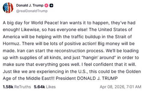 «Μια μεγάλη ημέρα για την Παγκόσμια Ειρήνη! Το Ιράν θέλει να συμβεί αυτό, νισάφι πια! Το ίδιο ισχύει και για όλους τους άλλους! Οι Ηνωμένες Πολιτείες της Αμερικής θα βοηθήσουν στη διαχείριση της κυκλοφοριακής συμφόρησης στο Στενό του Ορμούζ. Θα υπάρξουν πολλές θετικές ενέργειες! Πολλά λεφτά θα βγουν. Το Ιράν μπορεί να ξεκινήσει τη διαδικασία ανοικοδόμησης. Θα φορτώσουμε προμήθειες κάθε είδους και θα «τριγυρίζουμε στην περιοχή», ώστε να διασφαλίσουμε ότι όλα θα εξελιχθούν ομαλά. Πιστεύω με βεβαιότητα ότι έτσι θα γίνει. Οπως ακριβώς συμβαίνει τώρα στις Ηνωμένες Πολιτείες, αυτή θα μπορούσε να είναι η Χρυσή Εποχή της Μέσης Ανατολής!!! Πρόεδρος ΝΤΟΝΑΛΝΤ ΤΖ. ΤΡΑΜΠ»