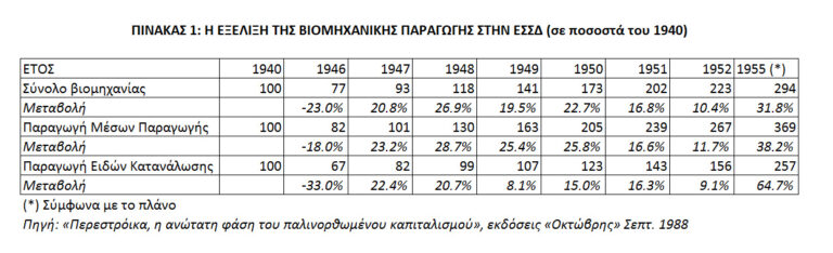 Η σοβιετική οικονομία κατόρθωσε ν’ αναστηλωθεί γρήγορα από τον Β’ Παγκόσμιο πόλεμο που κόστισε τη ζωή σε πάνω από 20 εκατομμύρια σοβιετικούς πολίτες. Η ανάπτυξη ήταν πραγματικά θυελλώδης, με τη σοβιετική βιομηχανία να ξεπερνά τα προπολεμικά επίπεδα το 1948, όπως φαίνεται από τον Πίνακα 1, που αναδημοσιεύουμε από τη μπροσούρα «Περεστρόικα – Η ανώτατη φάση του παλινορθωμένου καπιταλισμού» (εκδόσεις «Οχτώβρης», Σεπτ. 1988). Κι όχι μόνον αυτό. Η ανάπτυξη αυτή γινόταν παράλληλα με την πτώση των τιμών στο λιανικό εμπόριο. Πέντε φορές στο διάστημα 1947-1952 έπεσαν οι τιμές των εμπορευμάτων. Το 1952 οι τιμές τροφίμων και βιομηχανικών προϊόντων ήταν κατά μέσο όρο δύο φορές χαμηλότερες από το 1947[4]!