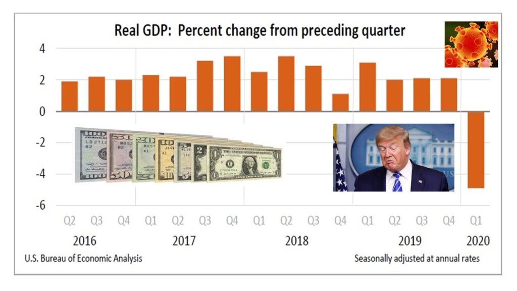 Οι εποχές που ο Τραμπ πανηγύριζε για την επίπλαστη ευμάρεια της αμερικάνικης οικονομίας ανήκουν πλέον στη σφαίρα των… παραμυθιών του παρελθόντος. Τώρα, με τον πιο επίσημο τρόπο, η αμερικάνικη οικονομία ξεκινά την κατρακύλα, αφού το ΑΕΠ του πρώτου τριμήνου αυτού του χρόνου μειώθηκε κατά 4,8%, σύμφωνα με το δελτίο Τύπου για την πορεία του αμερικάνικου ΑΕΠ του Γραφείου Οικονομικής Πολιτικής (Bureau of Economic Analysis – BEA), το οποίο ανήκει στο υπουργείο Εμπορίου των ΗΠΑ (βλ. https://www.bea.gov/news/blog/2020-04-29/gross-domestic-product-first-quarter-2020).