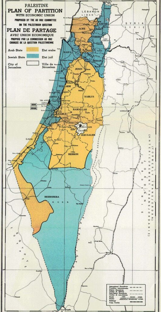 Φτάνουμε λοιπόν στο 1947, που η βρετανική κυριαρχία δεν αντέχει πλέον. Οχι μόνο οι Παλαιστίνιοι αλλά και πολλοί Εβραίοι ήταν ενάντιά της κι έτσι, κάτω από την πίεση του απελευθερωτικού κινήματος, οι Αγγλοι αναγκάζονται να προσφύγουν στον ΟΗΕ για τη λήξη της «εποπτείας». Η επιτροπή που συγκρότησε ο ΟΗΕ πρότεινε δύο σχέδια λύσεων: 1) Το σχέδιο της πλειοψηφίας, που προέβλεπε χωρισμό της χώρας, με οικονομική ένωση και 2) Το σχέδιο της μειοψηφίας που προέβλεπε ίδρυση ομοσπονδιακού κράτους. Σύμφωνα με την πρώτη λύση, η περιοχή της Παλαιστίνης θα χωριζόταν σε έξι κύρια μέρη (τρία για τους Εβραίους, έκτασης ίσης με το 56% του εδάφους και τρία για τους Παλαιστίνιους, έκτασης ίσης με το 43% του εδάφους). Η Ιερουσαλήμ και η περιοχή της θα διοικούνταν από τον ΟΗΕ, ενώ μια σειρά από αμιγείς αραβικές περιοχές θα περνούσαν στο εβραϊκό κράτος. Τη δεύτερη λύση υποστήριζε η Σοβιετική Ενωση. Η θέση της Σοβιετικής Ενωσης ήταν σαφής. Από τη στιγμή που η μαζική μετανάστευση των Εβραίων στην Παλαιστίνη ήταν ένα γεγονός και με δεδομένες τις εκτεταμένες σφαγές των Εβραίων από τους Ναζί, η δημιουργία ενός εβραϊκού κράτους μετά τη λήξη της βρετανικής εποπτείας της Παλαιστίνης ήταν αναπόφευκτη. Γι’ αυτό και η Σοβιετική Ενωση υποστήριξε τη δημιουργία ενός ομοσπονδιακού κράτους (Εβραίων με Παλαιστίνιους), με ταυτόχρονη αποχώρηση όλων των ξένων στρατευμάτων (δηλαδή των βρετανικών) από την περιοχή. Μόνο σε περίπτωση που κάτι τέτοιο απορριπτόταν (όπως και έγινε), η Σοβιετική Ενωση θα αναγνώριζε δύο κράτη με οικονομική ένωση μεταξύ τους. Μιλώντας το Νοέμβρη του 1947, ο σοβιετικός αντιπρόσωπος δήλωνε: «Η απαίτηση των Εβραίων να φτιάξουν δικό τους κράτος εξηγείται από το γεγονός ότι καμιά δυτικοευρωπαϊκή χώρα δεν ήταν σε θέση να εγγυηθεί την υπεράσπιση των στοιχειωδών δικαιωμάτων του εβραϊκού λαού ή να τον προφυλάξει από τις βιαιότητες των φασιστών δημίων… Τα συμφέροντα των Εβραίων και των Αράβων της Παλαιστίνης μπορούν να διαφυλαχθούν κατάλληλα μόνο με την ίδρυση ενός αραβο-εβραϊκού κράτους, ανεξάρτητου και δημοκρατικού».