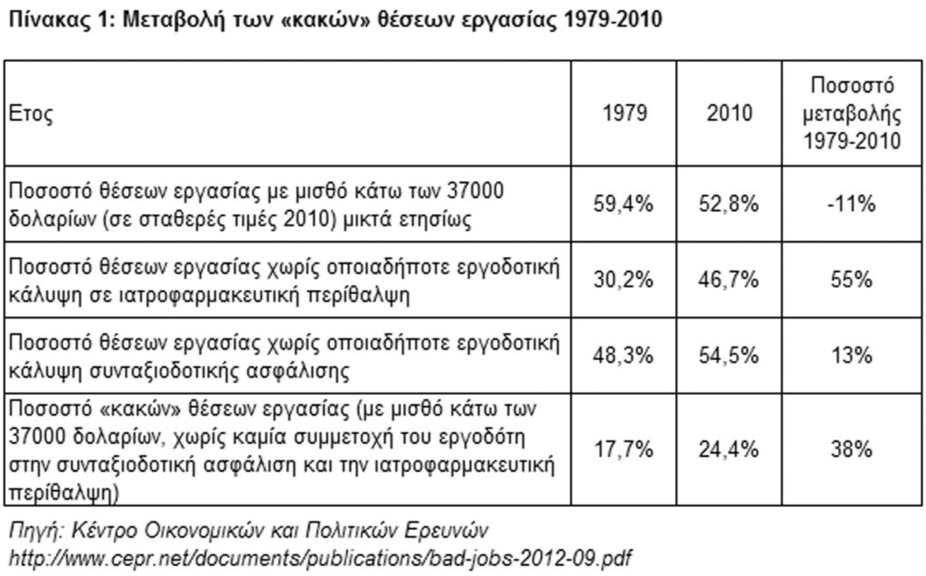 Οπως φαίνεται στον Πίνακα 1, που συντάξαμε βάσει των στοιχείων της παραπάνω έρευνας, το ποσοστό αυτών των θέσεων εργασίας αυξήθηκε κατά 38% μεταξύ 1979 και 2010, με αποτέλεσμα το ένα τέταρτο των θέσεων εργασίας το 2010 να βρίσκεται σε αυτή την κατηγορία. Η αύξηση του ποσοστού των «κακών» θέσεων εργασίας φαίνεται να μην οφείλεται στη μείωση του μισθού που παίρνει στο χέρι ο εργαζόμενος, αλλά στη μείωση του λεγόμενου «μη μισθολογικού κόστους», δηλαδή των χρημάτων που δίνουν οι καπιταλιστές για ιατροφαρμακευτική περίθαλψη και συνταξιοδοτική ασφάλιση των εργατών τους. Ετσι, το 2010 οι καπιταλιστές δεν πλήρωναν δεκάρα για την ιατροφαρμακευτική περίθαλψη του 46.7% των εργαζόμενων στις ΗΠΑ, ενώ για πάνω από τις μισές θέσεις εργασίας (54.5%) οι καπιταλιστές δεν πλήρωναν δεκάρα τσακιστή ούτε για τη σύνταξη!