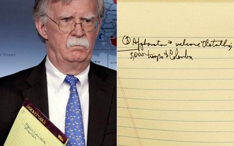 Από δίπλα η αμερικάνικη τρομοκρατία, με τον σύμβουλο εθνικής ασφάλειας των ΗΠΑ, Τζον Μπόλτον, να φιγουράρει σε συνέντευξη Τύπου με το μπλοκ των σημειώσεων παραμάσχαλα (ώστε να το βλέπουν καλά οι δημοσιογράφοι και να μπορούν να το απαθανατίσουν οι φωτογράφοι), στο οποίο έχει γράψει: «5.000 στρατιωτικοί στην Κολομβία». Και ο νοών νοείτω…
