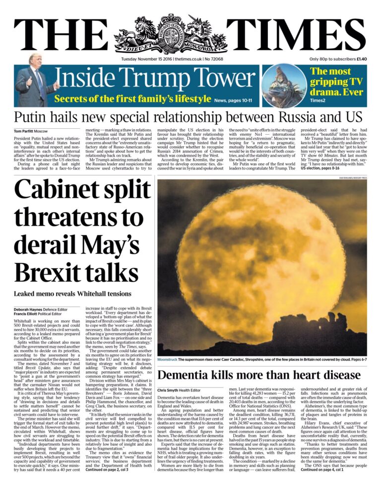 Κόλαφος για την βρετανίδα πρωθυπουργό Τερίζα Μέι ήταν το έγγραφο που διέρρευσε στους Τάιμς (που το έκαναν πρωτοσέλιδο) την περασμένη βδομάδα σχετικά με την ανυπαρξία σχεδίου για το Brexit. Το έγγραφο γράφτηκε από την εταιρία συμβούλων Deloitte και προοριζόταν για τα στελέχη της βρετανικής κυβέρνησης. Αναφέρει ότι η Μέι έχει πάρει εξ ολοκλήρου επάνω της το θέμα και τις αποφάσεις, πράγμα όμως που θα δημιουργήσει πρόβλημα αφού η κυβέρνηση φαίνεται να είναι διχασμένη, με τον υπουργό Εξωτερικών Μπόρις Τζόνσον, τον υπουργό Εμπορίου Λίαμ Φοξ και τον υπουργό Brexit Ντέιβιντ Ντάβις να τάσσονται υπέρ του Brexit, ενώ ο υπουργός Οικονομικών Φίλιπ Χάμοντ και ο υπουργός Επιχειρήσεων Γκρεγκ Κλαρκ τάσσονται κατά.