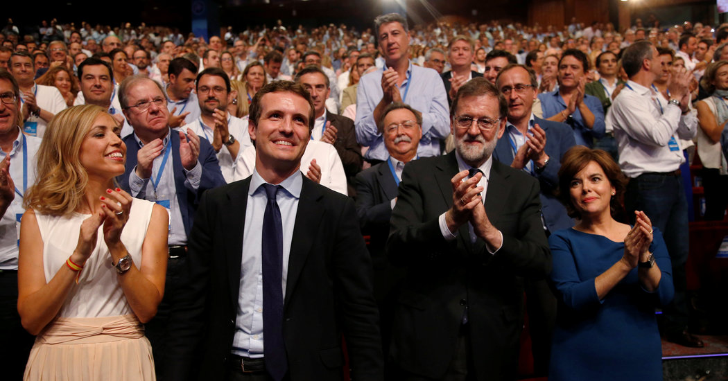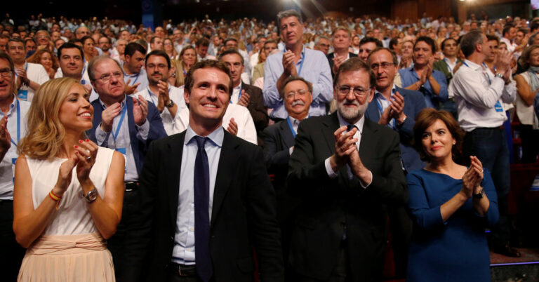 Η πολιτική μόδα απαιτεί να ανανεώνονται οι ηγεσίες των ευρωπαϊκών αστικών κομμάτων με νέους και φωτογενείς παράγοντες. Ετσι, το Λαϊκό Κόμμα της ισπανικής Δεξιάς ανέδειξε ως ηγέτη του τον 37χρονο Πάμπλο Κασάδο, που με 57% νίκησε «το κορίτσι του Ραχόι», την πρώην αντιπρόεδρο της κυβέρνησης Σοράγια Σάενθ ντε Σανταμαρία (δεξιά στη φωτογραφία, κάνει την ανάγκη φιλοτιμία και χειροκροτεί, μαζί με τον Ραχόι, το νικητή, που έχει πάντοτε στο πλευρό του τη «λαμπερή» σύζυγό του).
