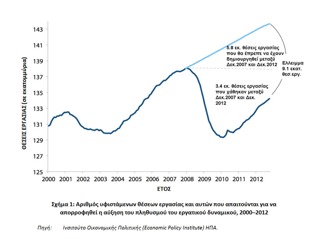 Οπως φαίνεται ανάγλυφα στο γράφημα, από το Δεκέμβρη του 2007 (που άρχισε η κρίση) μέχρι το Δεκέμβρη του 2012, οι συνολικές θέσεις εργασίας μειώθηκαν κατά 3.4 εκατομμύρια περίπου. Λαμβάνοντας υπόψη τον κανόνα που αναφέραμε παραπάνω, καταλήγουμε στο συμπέρασμα ότι στο διάστημα των πέντε αυτών χρόνων θα έπρεπε να έχουν δημιουργηθεί 5.8 εκατομμύρια νέες θέσεις εργασίας προκειμένου να μην αυξηθεί η ανεργία. Αυτό σημαίνει ότι υπάρχει ένα έλλειμμα 9.1 εκατομμυρίων θέσεων εργασίας. Οπως επισημαίνει η έκθεση, για να καλυφθεί αυτό το έλλειμμα απαιτείται ετήσια ανάπτυξη του Ακαθάριστου Εγχώριου Προϊόντος (ΑΕΠ) της τάξης του 5% για τουλάχιστον τρία χρόνια!