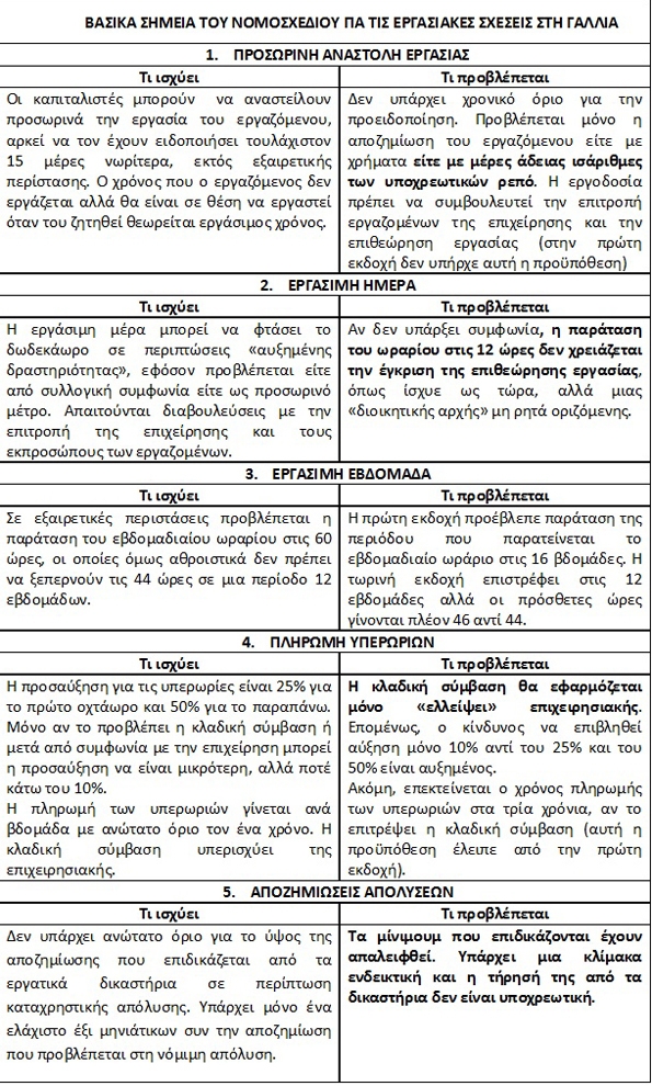 Στον πίνακα που δημοσιεύουμε (βάσει σχετικού δημοσιεύματος της Le Monde: https://www.lemonde.fr/les-decodeurs/article/2016/03/08/ce-que-contient-la-loi-travail-dans-le-detail_4878792_4355770.html) αναφέρονται ορισμένες μόνο πλευρές του νομοσχεδίου, που αρχικά είχε κατατεθεί στα μέσα Φλεβάρη (με σκληρότερα μέτρα), για να τροποποιηθεί μέσα στον Μάρτη, μετά από τις αντιδράσεις που προκάλεσε στη γαλλική κοινωνία. Το τελικό κείμενο δεν έχει ακόμα διαμορφωθεί, καθώς εκκρεμούν γύρω στις 800 τροπολογίες, όμως η κατεύθυνση θα είναι η ίδια.