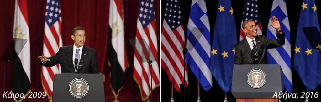 Πόσοι θυμούνται ότι ο Ομπάμα ξεκίνησε την προεδρική του θητεία με μια «ιστορική» (όπως χαρακτηρίστηκε) ομιλία στο Πανεπιστήμιο του Καΐρου, όπου υποσχέθηκε μια «νέα Μέση Ανατολή». Το σκηνικό ήταν ίδιο μ’ αυτό του Νιάρχειου: στο φόντο σημαίες της Αιγύπτου και των ΗΠΑ, μπροστά το βήμα με τον θυρεό της αμερικάνικης προεδρίας κι ο ομιλητής να παριστάνει πως εκφωνεί από στήθους (στην πραγματικότητα διαβάζει από teleprompters, κάτι λεπτές οθόνες που τοποθετούνται στο πλάι, δεξιά κι αριστερά του, στο ύψος των ματιών του) την ομιλία του, την οποία έχει προβάρει φυσικά.