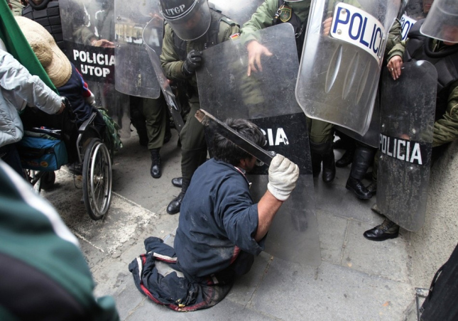 Την ίδια στιγμή, οι ανάπηροι κατέβαιναν στους δρόμους απαιτώντας να αυξηθούν τα χρήματα που παίρνουν από το κράτος. Ορισμένοι κρέμασαν τα καροτσάκια τους από μια γέφυρα για να τονίσουν τη σοβαρότητα της κατάστασης. Η κυβέρνηση έστειλε τα βολιβιανά ΜΑΤ να αποκαταστήσουν την τάξη, με αποτέλεσμα ορισμένοι διαδηλωτές να ξεκινήσουν απεργία πείνας.