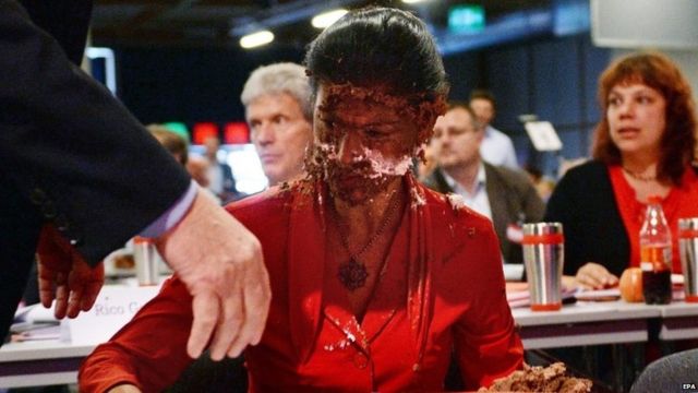 Τούρτα δέχτηκε η πρόεδρος της κοινοβουλευτικής ομάδας της γερμανικής Linke Σάρα Βάγκενκνεχτ, κατά τη διάρκεια συνεδρίου του κόμματος στο Μαγδεμβούργο. Ο λόγος; Δηλώσεις με τις οποίες τάχτηκε υπέρ της καθιέρωσης ανώτατου ορίου υποδοχής προσφύγων. Υπάρχουν όρια στις δυνατότητες υποδοχής προσφύγων και μεταναστών και στις δυνατότητες αποδοχής από την πλευρά της κοινωνίας, υποστήριξε στις επίμαχες δηλώσεις της η Βάγκενκνεχτ.