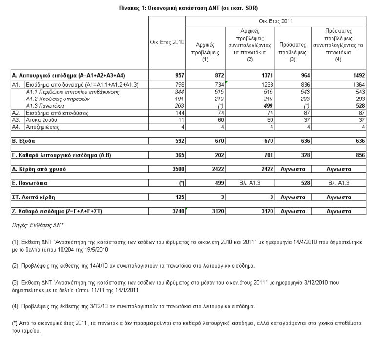 Τελικά τα πράγματα πήγαν ακόμα καλύτερα για το ΔΝΤ και τα ετήσια καθαρά λειτουργικά του έσοδα θα αυξηθούν κι άλλο, εκτινασσόμενα στα 856 εκ. SDR (δηλαδή περίπου 1.3 δισ. δολάρια), συνυπολογίζοντας τα πανωτόκια. Ποσοστό αύξησης της τάξης του 234% (από 365 σε 856)! Οπως φαίνεται από τον Πίνακα 1, αλλά και καθ’ ομολογία του ίδιου του ΔΝΤ στο τελευταίο δελτίο Τύπου που εξέδωσε, «οι προβλέψεις για το οικονομικό έτος 2011 άλλαξαν κυρίως ως αποτέλεσμα του υψηλότερου προβλεπόμενου εισοδήματος από δανεισμό» (Δελτίο Τύπου Νο. 11/11, 14/1/11).