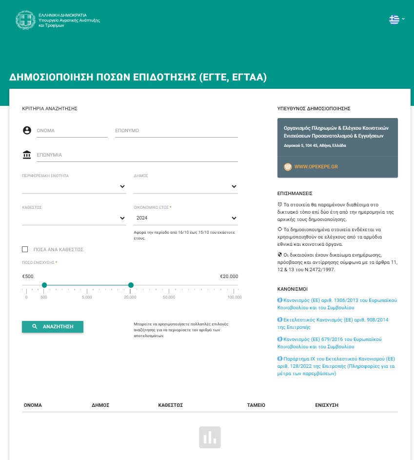 Οι κοινοτικές επιδοτήσεις δημοσιοποιούνται στη διεύθυνση https://transpay.opekepe.gr/?lang=el («Δημοσιοποίηση ποσών επιδότησης»).