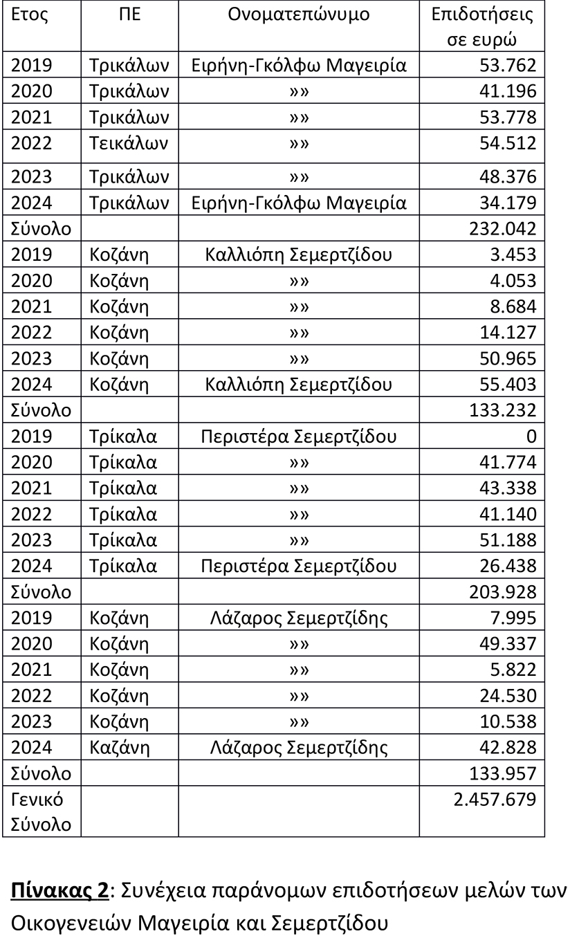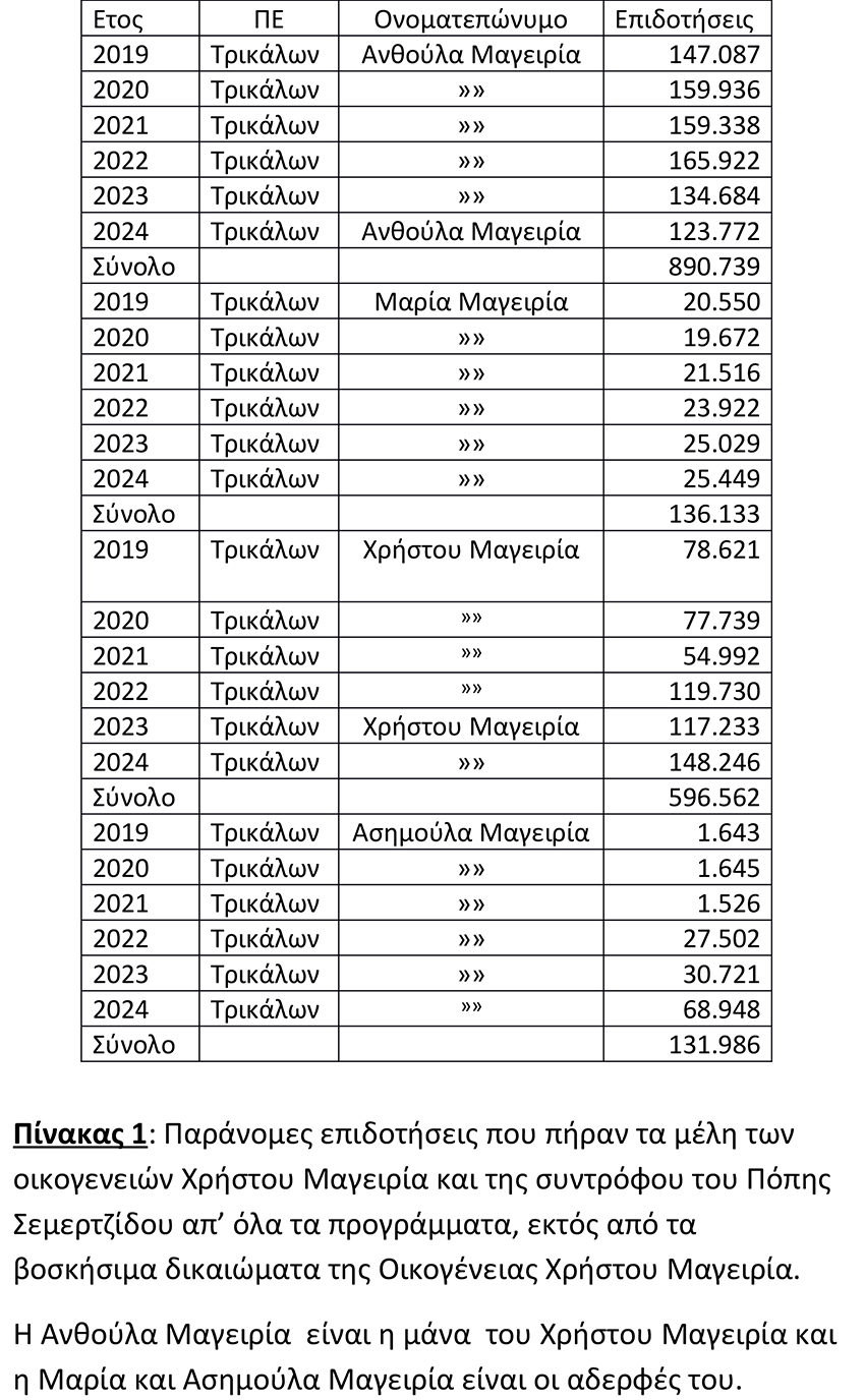 Στους Πίνακες 1 και 2 δημοσιεύουμε στοιχεία για τις επιδοτήσεις που έλαβαν την περίοδο 2019 μέχρι 2024 πέντε μέλη της οικογένειας Χρ. Μαγειρία και τρία μέλη της οικογένειας Καλ. Σεμερτζίδου για προγράμματα στα οποία δεν συμπεριλαμβάνονται τα δικαιώματα βοσκότοπων.