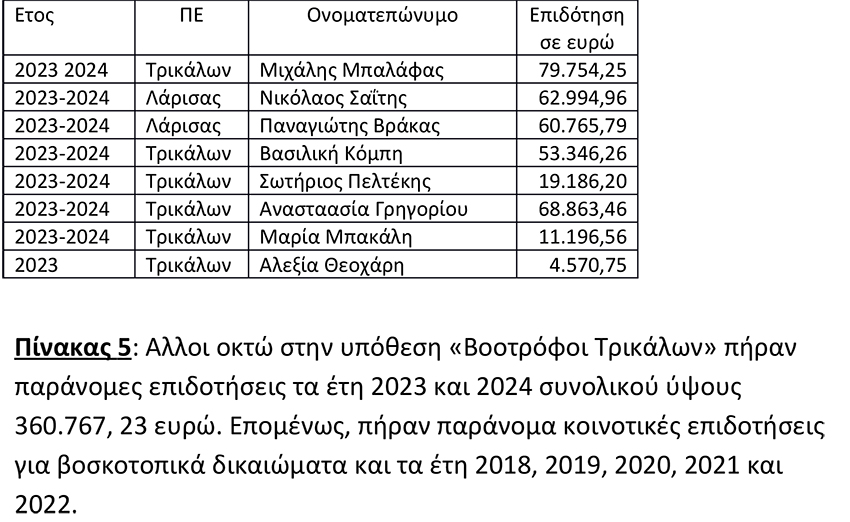 Από την ανοιχτή διαδικτυακή πύλη Δημοσιοποίηση Ποσών Επιδότησης, βάζοντας τα στοιχεία των «υπέρβαρων» κτηνοτρόφων και των «κτηνοτρόφων», που αναφέρονται στην Εκθεση Ελέγχου της Μ. Καρκαλέτσου (και στη μηνυτήρια αναφορά του Γρ. Βάρρα), διαπιστώσαμε ότι οι 15 απ΄αυτούς πήραν παράνομες κοινοτικές επιδοτήσεις το 2023 και το 2024 και μία πήρε παράνομες επιδοτήσεις το 2023. Αναφερόμαστε μόνο στο φούσκωμα των βοοειδών με το οποίο έλαβαν τα δικαιώματα βοσκότοπων.