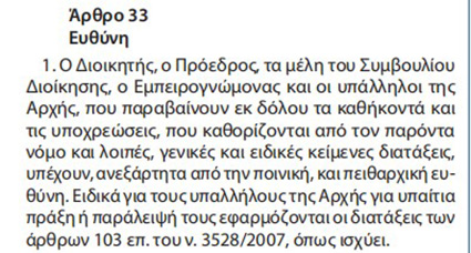 - Ο Διοικητής, ο Πρόεδρος, τα μέλη του Συμβουλίου Διοίκησης, ο Εμπειρογνώμονας και οι υπάλληλοι της Αρχής, που παραβαίνουν εκ δόλου τα καθήκοντά και τις υποχρεώσεις, που καθορίζονται από τον παρόντα νόμο και λοιπές, γενικές και ειδικές κείμενες διατάξεις, υπέχουν, ανεξάρτητα από την ποινική, και πειθαρχική ευθύνη. Ειδικά για τους υπαλλήλους της Αρχής για υπαίτια πράξη ή παράλειψή τους εφαρμόζονται οι διατάξεις των άρθρων 103 επ. του ν. 3528/2007, όπως ισχύει».