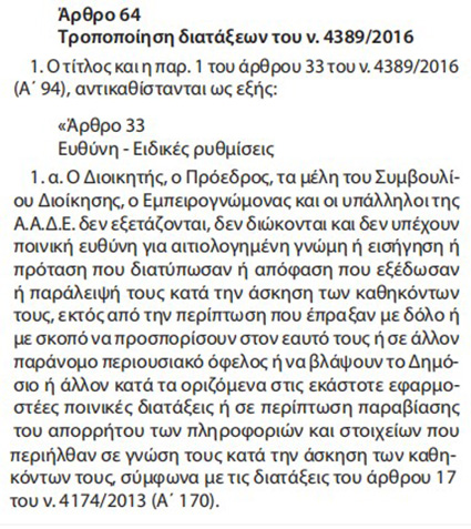 1.α. Ο Διοικητής, ο Πρόεδρος, τα μέλη του Συμβουλίου Διοίκησης, ο Εμπειρογνώμονας και οι υπάλληλοι της Α.Α.Δ.Ε. δεν εξετάζονται, δεν διώκονται και δεν υπέχουν ποινική ευθύνη για αιτιολογημένη γνώμη ή εισήγηση ή πρόταση που διατύπωσαν ή απόφαση που εξέδωσαν ή παράλειψή τους κατά την άσκηση των καθηκόντων τους, εκτός από την περίπτωση που έπραξαν με δόλο ή με σκοπό να προσπορίσουν στον εαυτό τους ή σε άλλον παράνομο περιουσιακό όφελος ή να βλάψουν το Δημόσιο ή άλλον κατά τα οριζόμενα στις εκάστοτε εφαρμοστέες ποινικές διατάξεις ή σε περίπτωση παραβίασης του απορρήτου των πληροφοριών και στοιχείων που περιήλθαν σε γνώση τους κατά την άσκηση των καθηκόντων τους, σύμφωνα με τις διατάξεις του άρθρου 17 του ν. 4174/2013 (A΄ 170)».