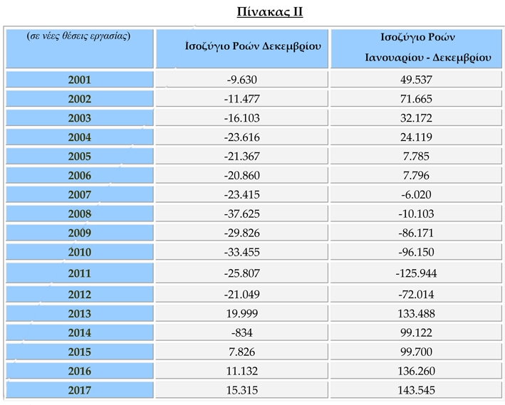 Στο Δελτίο Τύπου η Αχτσιόγλου κάνει μια αλχημεία. Ενώ στον Πίνακα ΙΙ της Εργάνης Δεκεμβρίου 2017 υπάρχουν στοιχεία για το «ισοζύγιο ροών» Γενάρη-Δεκέμβρη για μια ολόκληρη περίοδο, μέχρι και το 2017, το Δελτίο Τύπου αναφέρεται μόνο στο 2017. Οπως, όμως, μπορείτε να δείτε στον Πίνακα (δεν είναι δικός μας, της Εργάνης είναι) από το 2013 (δηλαδή επί Σαμαροβενιζέλων) εμφανίζονται θετικά «ισοζύγια ροών απασχόλησης». 133.484 το 2013, 99.122 το 2014, 99.700 το 2015, 136.260 το 2016. Η δήθεν αύξηση του 2017 δεν είναι σημαντικά μεγαλύτερη από τις δήθεν αυξήσεις των προηγούμενων χρόνων και ιδιαίτερα μ’ αυτές του 2013 και του 2016.