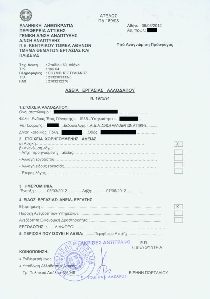Οι αιτούντες άσυλο μπορούν να πηγαίνουν στη Σταδίου 60, να επιδεικνύουν την κόκκινη κάρτα και να παίρνουν κανονικά την άδεια εργασίας. Μάλιστα, η σχετική διαδικασία πρόσφατα α-πλοποιήθηκε και δεν χρειάζεται πλέον να υποβάλλονται σε εξετάσεις σε κρατικό νοσοκομείο. Για του λόγου το αληθές παραθέτουμε και άδεια εργασίας αιτούντος άσυλο, που εκδόθηκε πρόσφατα.
