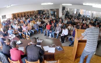 Από πότε έχει το συγκεκριμένο συνδικάτο με τα πολλές χιλιάδες γραμμένα μέλη να κάνει γενική συνέλευση στα γραφεία του; Κάποτε έκανε συνελεύσεις σε κλειστά γήπεδα. Μετά πέρασε στα θέατρα. Η αίθουσα των γραφείων του, πάντως, θεωρού-νταν πάντοτε μικρή, πολύ μικρή, ακόμα και για τις ετήσιες εθιμοτυπικές συνελεύσεις. Ούτε τα μέλη των διοικήσεων των παραρτημάτων δεν μπορούσε να χωρέσει. Τώρα, τους χωρά «όλους» και μάλιστα με άνεση, όπως φαίνεται από τη φωτογραφία. Περισσεύουν καρέκλες και γι’ άλλους.