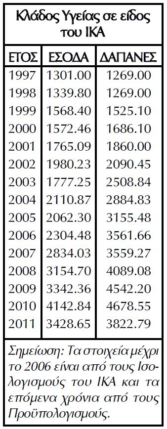 Ως τη στιγμή που γράφονται αυτές οι γραμμές, το ΔΣ του ΙΚΑ-ΕΤΑΜ έχει δημοσιεύσει τους ισολογισμούς μέχρι το 2006. Ο Πίνακας που δημοσιεύουμε με στοιχεία για τον Κλάδο Υγείας σε είδος μέχρι το 2006 περιλαμβάνει στοιχεία από τους Ισολογισμούς και από το 2007 μέχρι το 2011 από τους προϋπολογισμούς του ΙΚΑ-ΕΤΑΜ. Είναι στοιχεία εσόδων και στοιχεία δαπανών όχι μόνο για τη φαρμακευτική δαπάνη, αλλά για όλη την περίθαλψη.