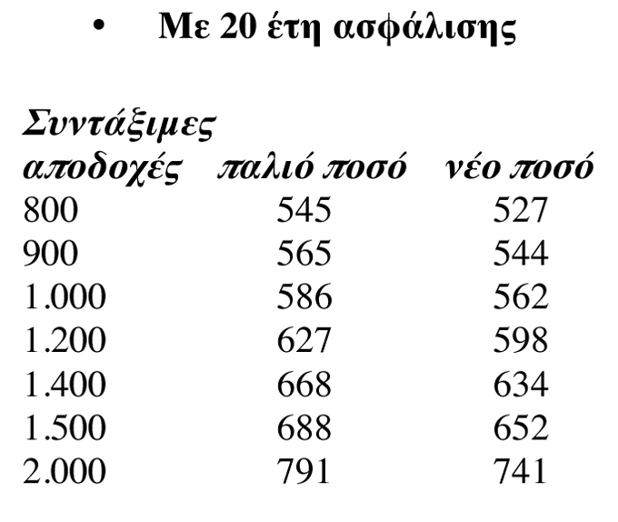 Ας πάρουμε έναν από τους πίνακες του Κουτρουμάνη, που αφορά ασφαλισμένο με 20 (πλήρη) έτη ασφάλισης. Στην πρώτη στήλη φαίνονται οι συντάξιμες αποδοχές, στη δεύτερη στήλη η σύνταξη με το παλιό σύστημα και στην τρίτη η σύνταξη με το σχέδιο Κατρούγκαλου (σύμφωνα με τον Κουτρουμάνη).