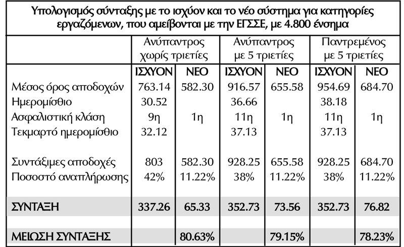 Ολος αυτός ο πίνακας, όμως, είναι ένα απατηλό κατασκεύασμα. Από την αρχή μέχρι το τέλος. Σε τι συνίσταται η απάτη; Στο ότι παίρνει τις ίδιες συντάξιμες αποδοχές με το παλιό και με το νέο σύστημα, ενώ υπάρχει τεράστια διαφορά μεταξύ τους. Ας πάρουμε το παράδειγμα αυτού που στον πίνακα φαίνεται να έχει συντάξιμες αποδοχές 800 ευρώ. Με το παλιό ασφαλιστικό σύστημα, οι συντάξιμες αποδοχές υπολογίζονταν με το μέσο όρο της τελευταίας πενταετίας (παλιότερα ίσχυε ο μέσος όρος της τελευταίας διετίας και ακόμα πιο παλιά ο τελευταίος μισθός). Με το νέο σύστημα, όμως, δηλαδή και με το νόμο Λοβέρδου-Κουτρουμάνη και με το σχέδιο Κατρούγκαλου, οι συντάξιμες αποδοχές υπολογίζονται με το μέσο όρο ολόκληρου του ασφαλιστικού βίου. Επομένως, εκείνος που με βάση την πενταετία είχε συντάξιμες αποδοχές 800 ευρώ, με βάση ολόκληρο τον ασφαλιστικό βίο θα έχει πολύ μικρότερες συντάξιμες αποδοχές και όχι 800 ευρώ. Οταν, λοιπόν, κάνεις υπολογισμούς βάζοντας τις ίδιες συντάξιμες αποδοχές στο παλιό και το νέο σύστημα και πολλαπλασιάζοντας με τα κατά περίπτωση ποσοστά αναπλήρωσης, για να υπολογίσεις τη σύνταξη, διαπράττεις απάτη ολκής.
