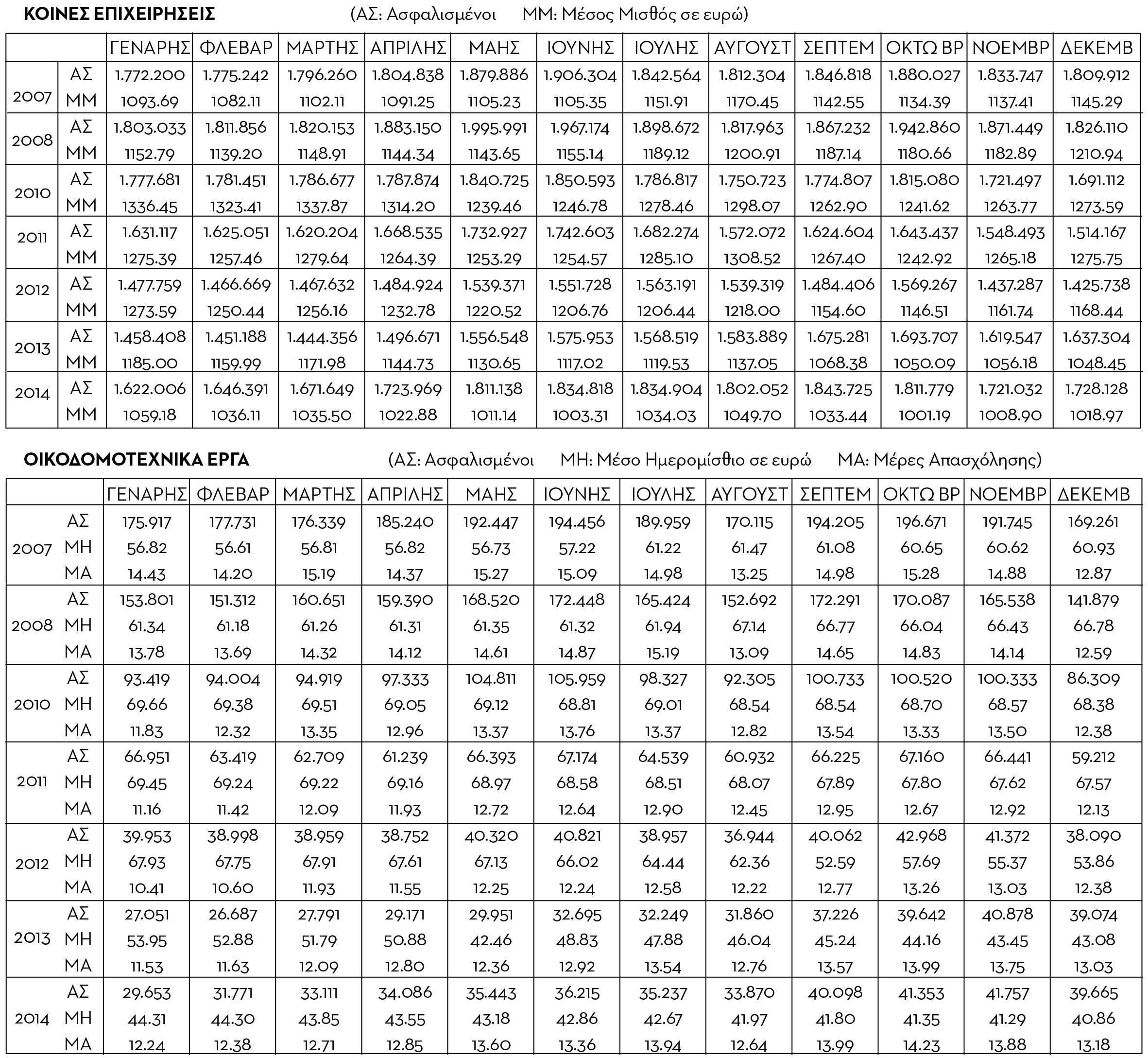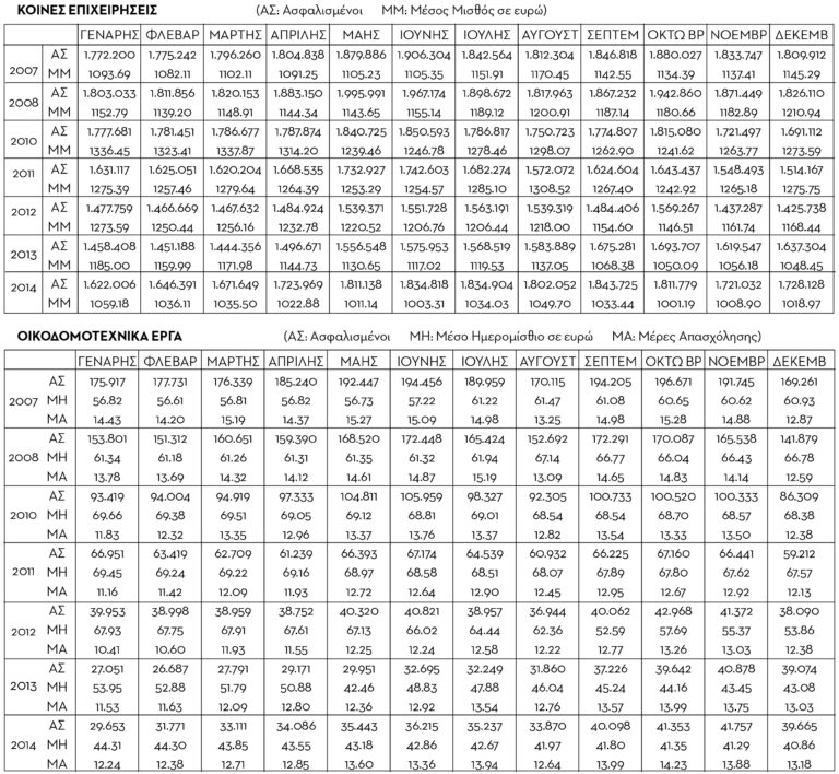 H Διεύθυνση Αναλογιστικών Μελετών και Στατιστικής του IKA, στην κατηγορία Κοινές Επιχειρήσεις έφτιαξε πίνακες, αθροίζοντας τους εργαζόμενους με πλήρη και μερική απασχόληση, ενώ υπολόγισε μέσο μεροκάματο, μέση απασχόληση ανά μήνα και μέσο μισθό. Στην κατηγορία Οικοδομοτεχνικά Εργα υπολόγισε μέσο ημερομίσθιο και μέση απασχόληση. Με βάση αυτά τα στοιχεία φτιάξαμε τους πίνακες που δημοσιεύουμε. Σ’ αυτούς περιλάβαμε τα στοιχεία των ετών 2007 και 2008 (ήταν οι δύο καλύτερες χρονιές της περιόδου 2004-2009, πριν το ξέσπασμα της κρίσης δηλαδή), τα οποία συγκρίνουμε με τα στοιχεία των ετών από το 2010 μέχρι το 2014, που είναι η περίοδος της βαθιάς καπιταλιστικής κρίσης και της μνημονιακής λαίλαπας.