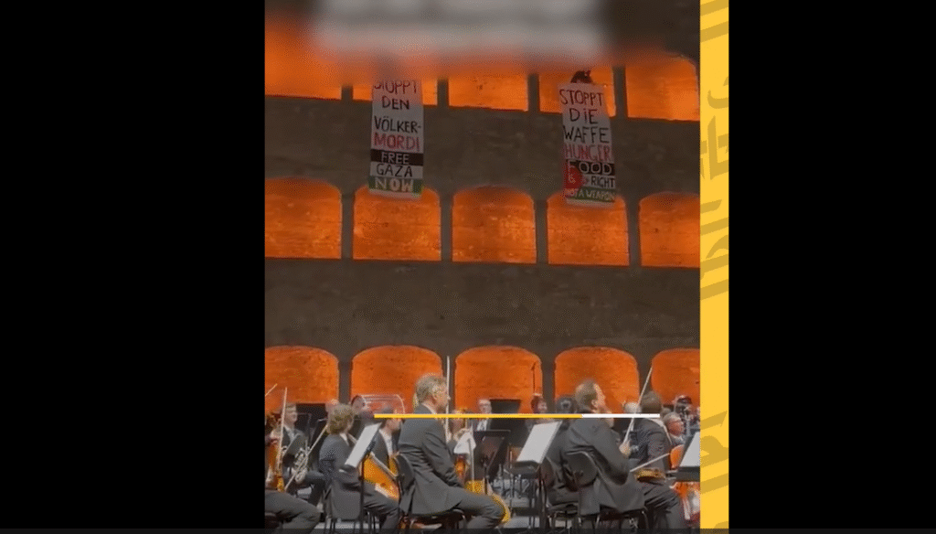 Υστερα πήρε το λόγο ο (σοσιαλδημοκράτης) υπουργός Πολιτισμού, Αντρέας Μπάμπλερ. Τότε εισέβαλε στο χώρο ομάδα φοιτητών και εβραίων (ναι, εβραίων!), που προχώρησε σε μια από τις πιο ηχηρές καταγγελίες της συνενοχής στη γενοκτονία. Κάποιοι εισέβαλαν στη σκηνή κρατώντας παλαιστινιακές σημαίες και φωνάζοντας «Να σταματήσει η γενοκτονία», «Λευτεριά στη Γάζα τώρα» και «Εχετε αίμα στα χέρια σας». Κι ενώ οι κουστουμαρισμένοι σεκιουριτάδες προσπαθούσαν να τους κατεβάσουν σηκωτούς από τη σκηνή, άλλοι είχαν σκαρφαλώσει ψηλά, στο βάθος του σκηνικού, και ξετύλιξαν μεγάλα πανό ίδιου περιεχομένου.