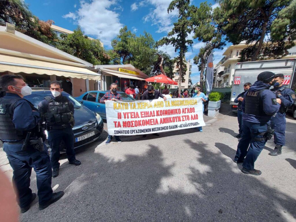 Eκτός νοσοκομείου διαμαρτύρονταν υγειονομικοί που είναι σε αναστολή εργασίας, υπό την… προστασία των ΜΑΤ.
