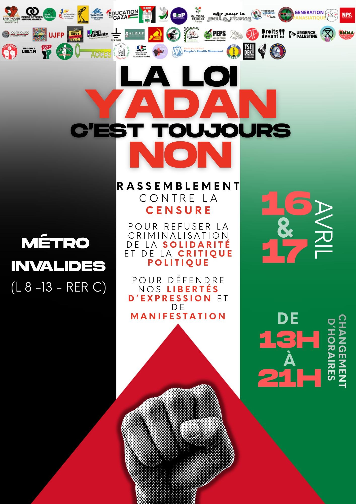 Ενα πλήθος οργανώσεων καλεί την Πέμπτη 16 Απρίλη και την Παρασκευή 17 Απρίλη σε μαζικές συγκεντρώσεις έξω από την Εθνοσυνέλευση, απαιτώντας να μην περάσει αυτή η αισχρή πρόταση νόμου που καταπατά την ελευθερία της έκφρασης και την ελευθερία των λαών.