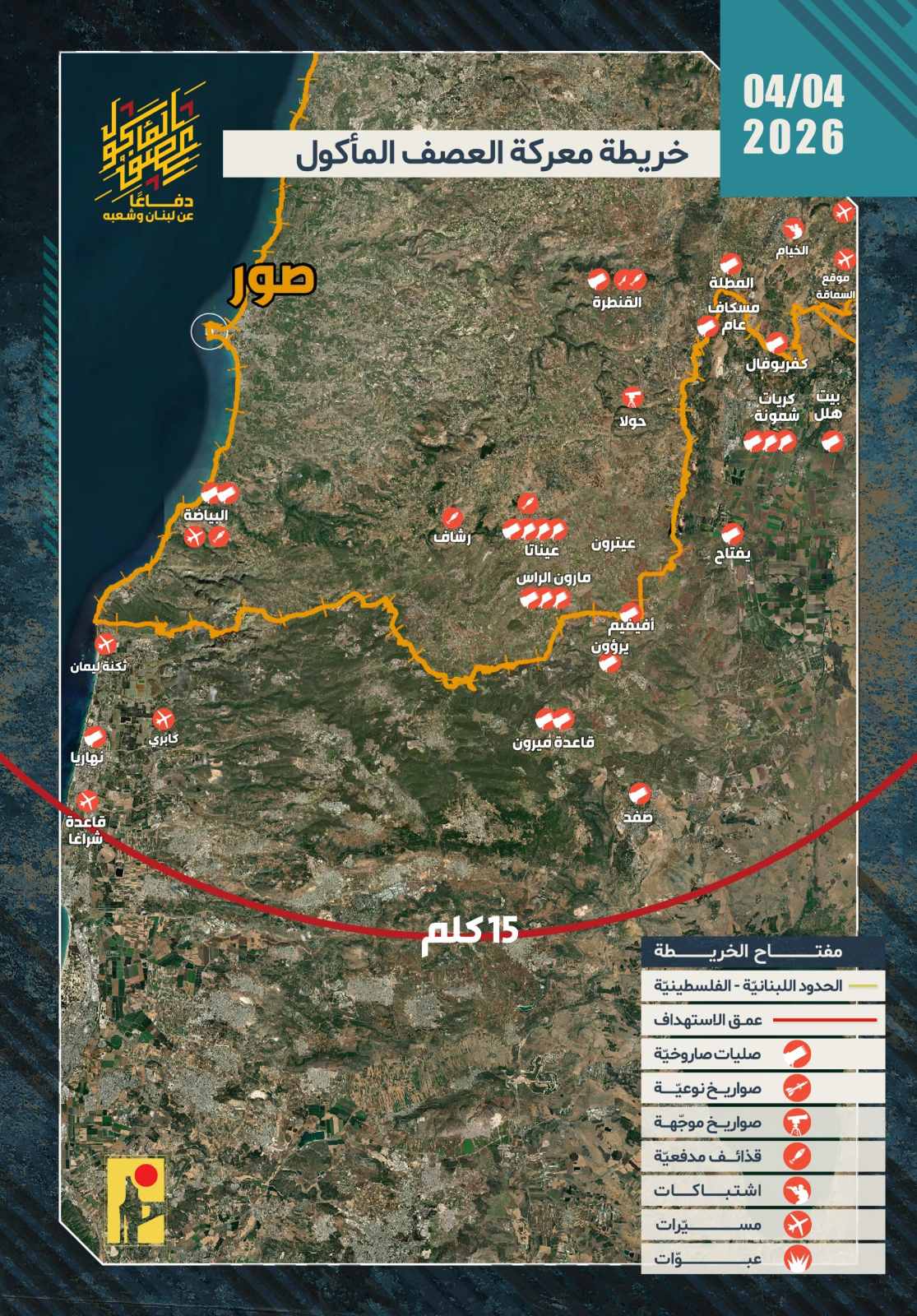 Σε υπεράσπιση του Λιβάνου και του λαού του, η Ισλαμική Αντίσταση εξέδωσε το Σάββατο 04/04/2026, 38 στρατιωτικές ανακοινώσεις σχετικά με τις επιχειρήσεις αντιμετώπισης των κινήσεων του ισραηλινού εχθρού στα σύνορα Λιβάνου-Παλαιστίνης, καθώς και τις επιχειρήσεις στόχευσης στρατιωτικών θέσεων, βάσεων, συγκεντρώσεων του ισραηλινού στρατού και των εποικισμών του στη βόρεια κατεχόμενη Παλαιστίνη, ως εξής: