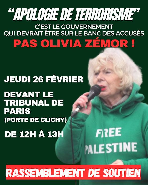 Εκφράζουμε την αλληλεγγύη μας προς την Olivia Zémor συμμετέχοντας μαζικά σε ΣΥΓΚΕΝΤΡΩΣΗ ΑΛΛΗΛΕΓΓΥΗΣ ΤΗΝ ΠΕΜΠΤΗ 26 ΦΛΕΒΑΡΗ ΑΠΟ ΤΙΣ 12:00 ΕΩΣ ΤΙΣ 13:00, ΕΞΩ ΑΠΟ ΤΟ ΔΙΚΑΣΤΙΚΟ ΜΕΓΑΡΟ ΤΟΥ ΠΑΡΙΣΙΟΥ στην Porte de Clichy (Μετρό γραμμές 13 και 14, RER C).