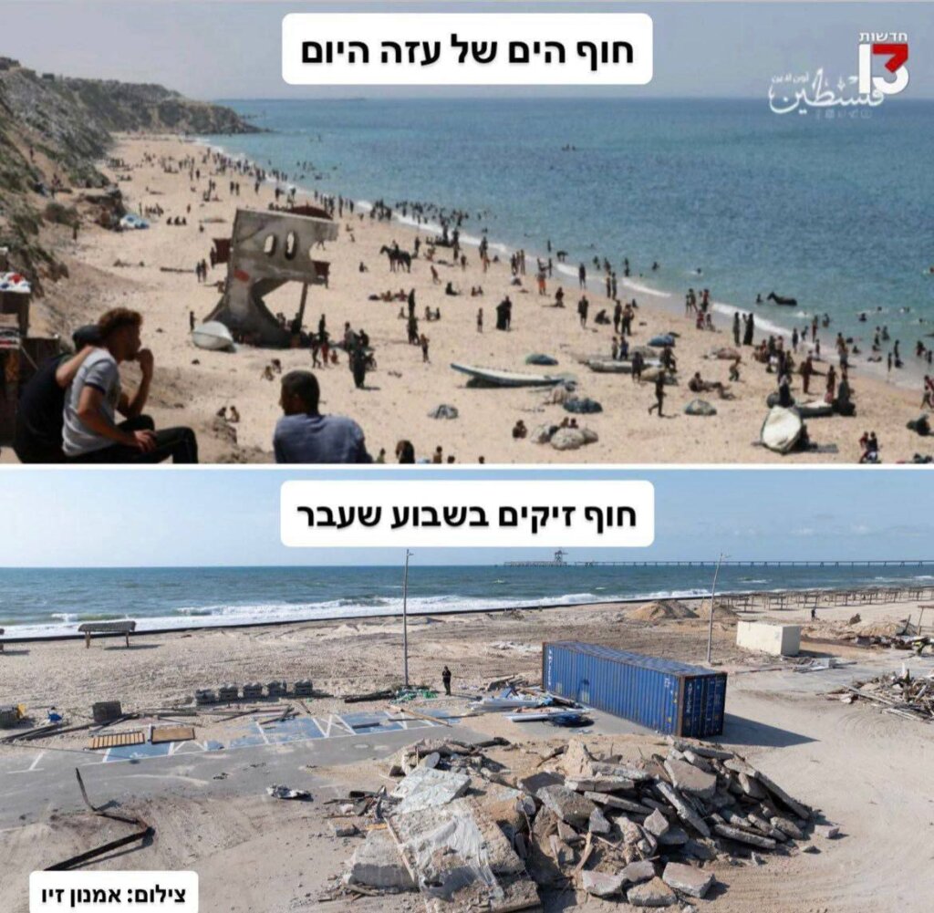 Ο Μπούκερ δημοσίευσε δύο φωτογραφίες. Η πάνω δείχνει τους κατοίκους της Γάζας να έχουν ξεχυθεί στην παραλία για μπάνιο. Μπορεί να έχουν δεκάδες χιλιάδες νεκρούς, μπορεί να βομβαρδίζονται σε καθημερινή βάση, μπορεί τα σπίτια τους να έχουν ισοπεδωθεί, μπορεί να μην έχουν να φάνει, αλλά μόλις ζέστανε λίγο ο καιρός, αυτοί έτρεξαν στη θάλασσα, όπως κάνουν κάθε χρόνο.